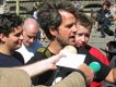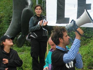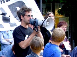 Christoph Schlingensief samt Megafon auf eine interessierte Gruppe